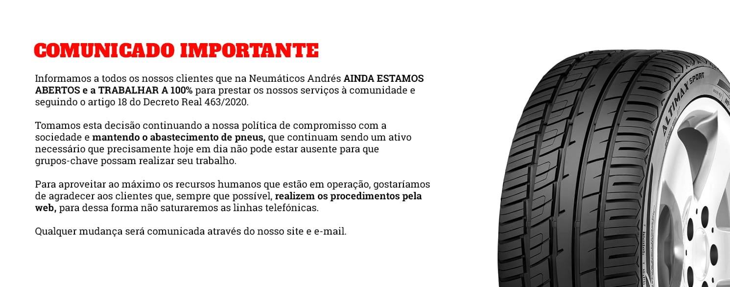 Com mais de 30 anos de expeciência, Neumáticos Andrés continua a ser uma referência do sector de pneumáticos em Espanha e Portugal, apresentando-se como a opção mais sólida e rentável para o sector profissional. A nossa estratégia concentra-se no cliente, na qual consideramos os nossos parceiros de negócios com os quais procura alcançar uma maior rentabilidade, tanto para o fornecedor como para o cliente.